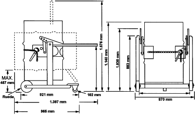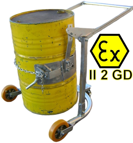 ATEX II 2GD drums rotator, suitable for steel drums thanks to its adjustable ratchet. With its lever, drums are lifted, spin, agitate, emptied and transported easily.