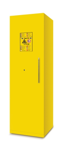 Fireproof cabinet RF-90. exterior dimensions 595x600x2.055, perfect protection of flammable liquids. Constructed and approved according to EN 14470-1 (RF 90 - Fire resistance> 90 minutes). Protection according to DIN 4102. Painted in RAL 1007 . Height shelves with bucket adjustable at intervals of 64 mm, secured against overturning fluid, with a capacity of 22 liters. Capacity per shelf 80 kg. Doors with automatic thermal shutdown. Vent Connection DN 75 for removal of air inside the cabinet. Emergency opening device. CE Marked.