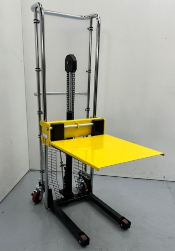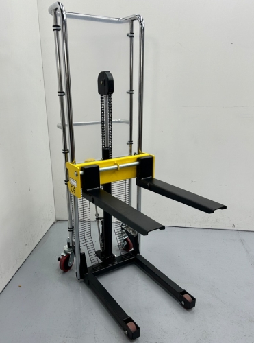 Apilador de traslación y elevación manual con gran facilidad de maniobra. Capacidad 400Kg. Marcado CE.