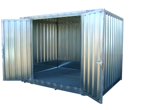 Caseta galvanizada de 3.005 x 2.170 x 2.300, perfecta para almacenaje de productos químicos. Caseta fácil de limpiar. Paredes galvanizadas trapezoidales que proporcionan una estructura muy robusta. Cubeta de retención de 870 litros, 2 puertas con cerradura y rejilla de ventilación. Se suministra sin estanterías.