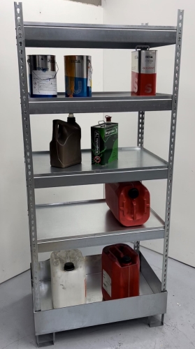 Estantería galvanizada con cubetas, especialmente indicada para el almacenaje de productos peligrosos. Resistente a la humedad. Capacidad de carga por balda de 50 kg. Cubeta galvanizada de retención de 90 litros.
