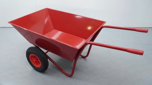 Carro con cuba de acero, muy cómodo. Por su geometría y tamaño permite transportar grandes cantidades de material. Sus dos ruedas aseguran una gran estabilidad.