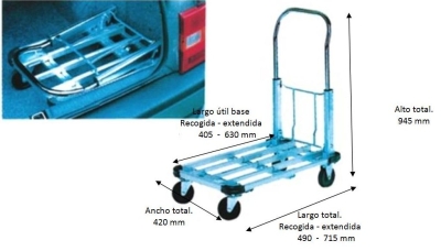 Carro plegable, fabricado en aluminio y muy ligero, con protectores en las esquinas y con mango auto-ajustable. Dimensiones plegado 500 x 420 x 235.