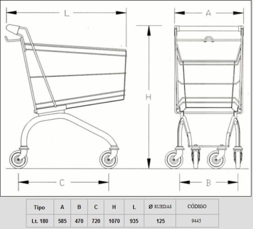 Carro de Hipermercado con unas dimensiones de 1.000 x 610 x 1.035, con una capacidad de 180 litros. Acabado zincado brillante. Dotado con 4 ruedas de goma pivotantes Ø 125 mm.