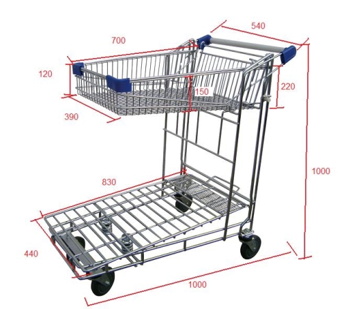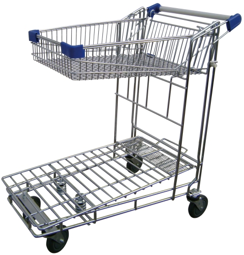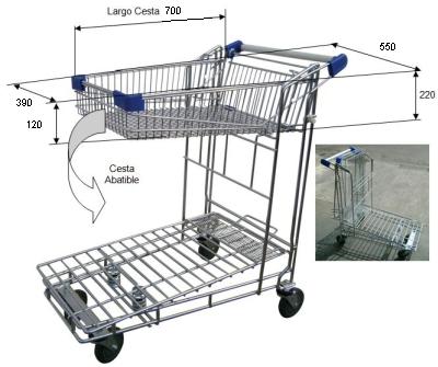 Carro encajable con varilla zincada, resistente a cargas de hasta 380Kg + 20Kg en cesta. Ergonomía garantizada mediante la plataforma sobreelevada para facilitar la carga y la recogida de bultos. Cuatro ruedas giratorias de goma. Cesta superior abatible.