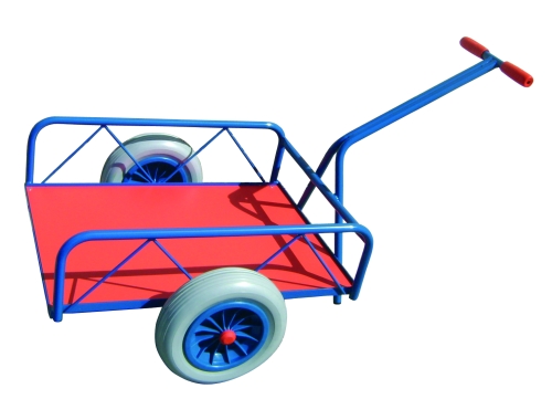 Carro pescatero o remolque de un eje, perfecto para el transporte de cargas voluminosas, fabricado en tubo de acero muy resistente y superficie de carga de fibra de madera. Ruedas Ø350 ref. 30-653 de goma maciza. Capacidad de carga 300Kg. Base de madera plastificada.