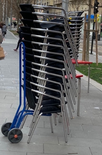 Carro perfecto para el transporte de sillas, fabricado en tubo de acero muy resistente. Capacidad de carga 75 Kg.