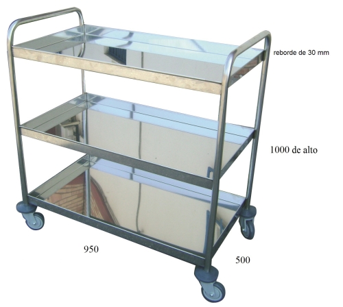 Carro de hostelería, fabricado en acero inoxidable, 3 bandejas con superficies de gran resistencia y con fondo de 45 mm, perfecto para el transporte y almacenaje de todo tipo de artículos, capacidad máxima es de 150Kg. 4 ruedas giratorias de goma gris. Cuatro protectores para los golpes.