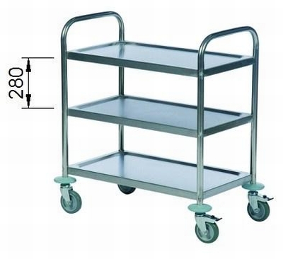 Carro de hostelería fabricado en acero inoxidable, 3 bandejas con superficies de gran resistencia, perfecto para el transporte y almacenaje de todo tipo de artículos, capacidad máxima es de 150 Kg. 4 ruedas giratorias de goma gris. Cuatro protectores para los golpes. Bandeja superior situada a una altura de 680 mm. Distancia entre baldas 200 mm. Bandeja de 680 x 380 mm.