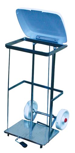 Carro de desperdicios de acero inoxidable para bolsa de basura con tapa basculante mediante pedal. Capacidad de 100 litros. Ruedas de goma gris para un transporte cómodo y de fácil manejo.