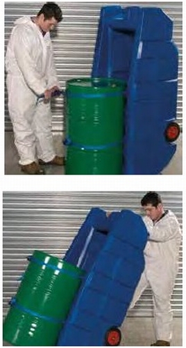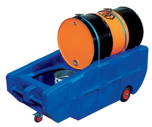 Carro volteador de bidones de 220 litros con cubeta de recolección