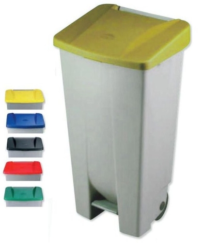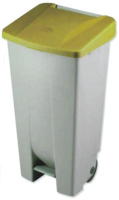 Contenedor selectivo de 120 L con ruedas y pedal de apertura de tapa, idel para jardinería, comunidades, hostelería, industria, clasificación de residuos etc. Tapas de color amarilla.