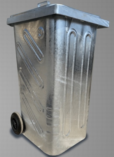 Contenedor Galvanizado resistente a altas y bajas temperaturas. Ruedas estampadas de caucho macizo. Capacidad de 120 litros. Asas posteriores para permitir y facilitar su movimiento. Tapa con bisagras sobre el borde lateral de las asas y dotado de dos tomas para su levantamiento. Fácilmente lavable con agua.
