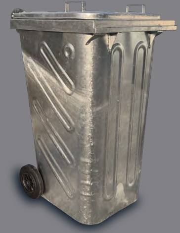 Contenedor Galvanizado resistente a altas y bajas temperaturas. Ruedas estampadas de caucho macizo. Capacidad de 240 litros. Asas posteriores para permitir y facilitar su movimiento. Tapa con bisagras sobre el borde lateral de las asas y dotado de dos tomas para su levantamiento. Fácilmente lavable con agua.