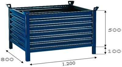 Contenedor realizado en chapa de acero de 2 mm de espesor, útil para grandes cargas hasta 2.000 Kg y reforzado mediante pliegues nervados en forma de "V" en los laterales y en su base. Con lo que se ha conseguido una mayor resistencia que le hacen de gran utilidad para el almacenamiento y transporte de mercancías. Su gran resistencia y las sólidas esquinas del contenedor junto con las orejetas, proporcionan la posibilidad de una apilación hasta 5 alturas entre contenedores muy estables y segura. Posee orejetas para poder enganchar a grúa. RAL 5001