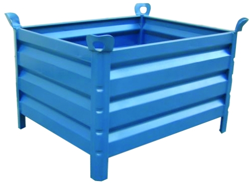 Contenedor realizado en chapa de acero de 2 mm de espesor, útil para grandes cargas hasta 2.000 Kg y reforzado mediante pliegues nervados en forma de "V" en los laterales y en su base. Con lo que se ha conseguido una mayor resistencia que le hacen de gran utilidad para el almacenamiento y transporte de mercancías. Su gran resistencia y las sólidas esquinas del contenedor junto con las orejetas, proporcionan la posibilidad de una apilación hasta 5 alturas entre contenedores muy estables y segura. Posee orejetas para poder enganchar a grúa. RAL 5001