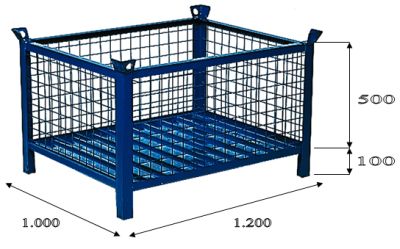 Contenedor realizados en chapa de acero de 2 mm de espesor, útil para grandes cargas hasta 2.000 Kg y reforzado mediante pliegues nervados en su base en forma de "V". Laterales de malla reforzada con una luz de 50x50 siendode gran utiliad para el almacenamiento y transporte de mercancías en que se desea que sea visible su contenido. Contenedores para el almacenamiento y transporte de mercancías. Su gran resistencia y las sólidas esquinas del contenedor y sus orejetas le proporcionan la posibilidad de una apilación de hasta 5 alturas entre contenedores muy estables y segura. Posee orejetas para enganchar a grúa. RAL 5001