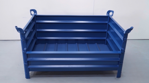 Contenedor realizado en chapa de acero de 2 mm de espesor, útil para grandes cargas hasta 2.000 Kg y reforzado mediante pliegues nervados en forma de "V" en los laterales y en su base. Con lo que se ha conseguido una mayor resistencia que le hacen de gran utilidad para el almacenamiento y transporte de mercancías. Su gran resistencia y las sólidas esquinas del contenedor junto con las orejetas, proporcionan la posibilidad de una apilación hasta 5 alturas entre contenedores muy estables y segura. Posee orejetas para poder enganchar a grúa. RAL 5001