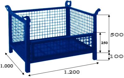 Contenedor realizados en chapa de acero de 2 mm de espesor, útil para grandes cargas hasta 2.000 Kg y reforzado mediante pliegues nervados en su base en forma de "V". Laterales de malla reforzada con una luz de 50x50 siendode gran utiliad para el almacenamiento y transporte de mercancías en que se desea que sea visible su contenido. Contenedores para el almacenamiento y transporte de mercancías. Su gran resistencia y las sólidas esquinas del contenedor y sus orejetas le proporcionan la posibilidad de una apilación de hasta 5 alturas entre contenedores muy estables y segura. Posee orejetas para enganchar a grúa. RAL 5001