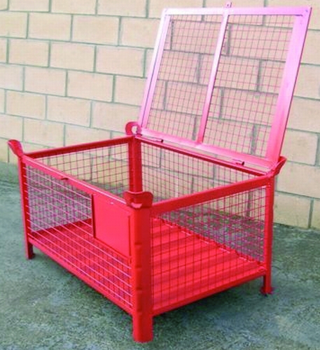 Contenedor con tapa, fabricado en chapa de acero de 2 mm de espesor, útil para grandes cargas hasta 2.000 Kg y reforzado mediante pliegues nervados en su base en forma de "V". Laterales de malla reforzada con una luz de 50x50 siendode gran utiliad para el almacenamiento y transporte de mercancías en que se desea que sea visible su contenido. Contenedores para el almacenamiento y transporte de mercancías. Su gran resistencia y las sólidas esquinas del contenedor y sus orejetas le proporcionan la posibilidad de una apilación de hasta 5 alturas entre contenedores muy estables y segura. Posee orejetas para enganchar a grúa. Fabricado a medida, consúltenos.