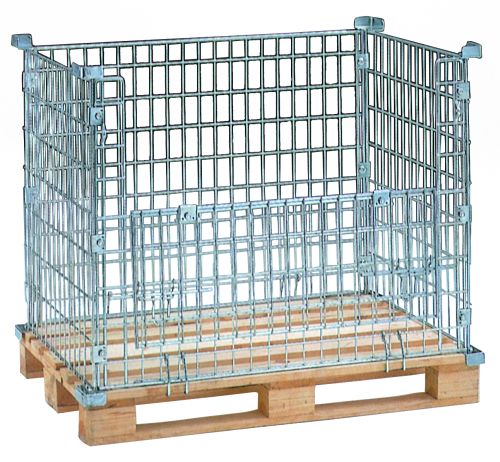 Cestón plegable para poner en un palet de madera, perfecto para utilizarlo en el almacenaje de todo tipo de mercancías de consumo, recambios, etc. Es apilable sobre si mismo y completamente plegable sobre su misma base. Acabado superficial zincado electrolítico brillante. Capacidad de Carga hasta 800 Kg. otras alturas disponibles. Se suministra sin palet.