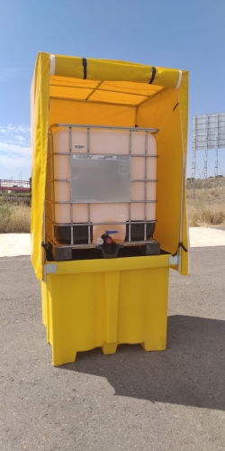 Cubeta polietileno de retención de líquidos para 1 depósitos de 1.000 litros con toldo de protección. De apertura enrollable en el frente.Fácil de limpiar gracias a la rejilla extraíble. Incorpora huecos para una perfecta manipulación con carretillas elevadoras.