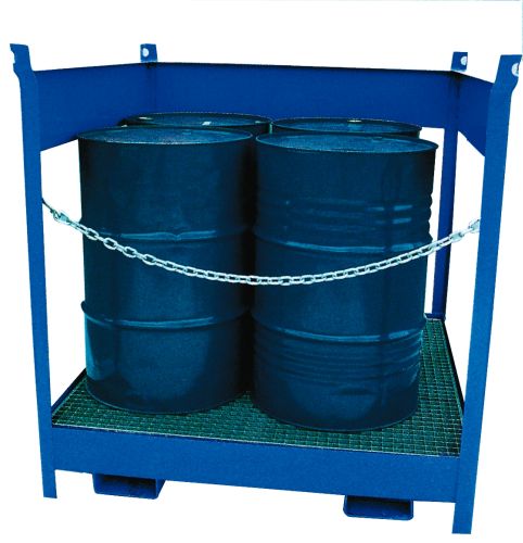 Contenedor para 4 bidones para carretilla, apilable y fabricado en acero muy resistente con cubeta para el derrame de residuos con una capacidad de 220 litros. Capacidad de carga máxima de 1.300 kg.