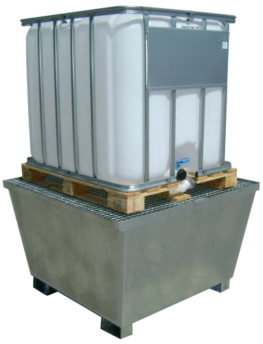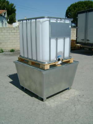 Cubeta colectora con rejilla galvanizada para depósitos de 1.000 litros, perfecta para ubicar sobre ella productos químicos o peligrosos. Capacidad 1.000 litros. Dimensiones 1.475 x 1.450 x 592 + 100.