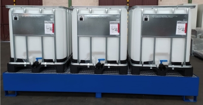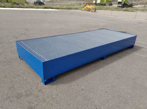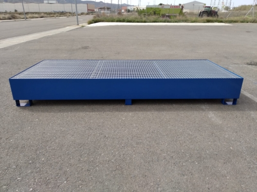 Cubeta colectora con rejilla pintada para 3 depósitos de 1.000 litros, perfecta para recoger los derrames de productos químicos o peligrosos. Dimensiones 3.280 x 1.300 x 420. Capacidad máxima de carga 5.500 kg.