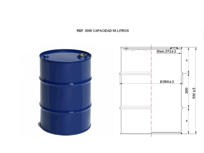 Bidón de chapa de 55 litros con 2 bocas, fabricado en acero laminado en frío de primera calidad con un Ø 386mm, altura de 530 mm y un espesor de 0,7mm. Provistos de 2 tapones de 2” y 3/4” de acero. Aptos para el envasado de productos líquidos. Homologados para el transporte de mercancías peligrosas.Sin pintura interior.
