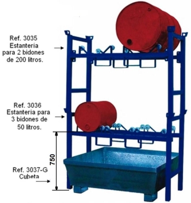 Palet para 2 bidones de 200 litros apilable hasta 3 alturas. Fabricado en acero perfilado muy resistente. Posee 4 ruedas de nylon por cada bidón para una perfecta rotación del mismo. Capacidad de carga 800 kg. Se recomienda el uso del implemento 3058.