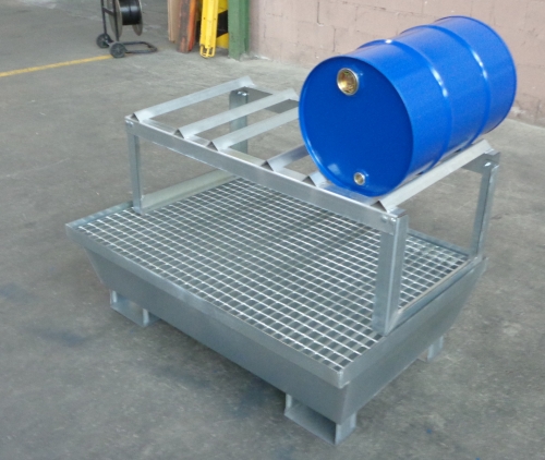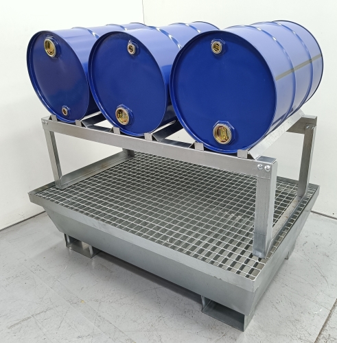 Estante galvanizado para 3 bidones de 50 litros con dimensiones 1.150 x 465 x 450. Capacidad de carga máxima de 200 kg.CUBETA NO INCLUIDA