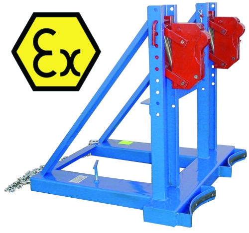Pinzas para el transporte ATEX, sujeción o elevación de 2 bidones de 50-200 Litros y que no superen los 500 Kg cada uno. Manejo sencillo y seguro ya que posee un mecanismo especial de sujeción. Posee una pinza de sujeción regulable para la adaptación a los distintos tamaños de bidones. Estructura muy robusta fabricada en acero perfilado para el uso de carretillas. Marcado CE/EX.