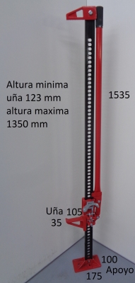 Gato Mecánico perfecto para elevar, empujar o tirar de cualquier cosa hasta 3.000 Kg. Con una altura de 1,35 metros, la característica más importante es el nivel de seguridad de su funcionamiento. Su característica de Calidad es el eslabón de seguridad. Uña de apoyo 118x38.