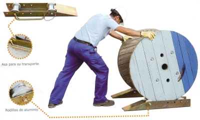 Conjunto formado por 2 patines de rodadura con rodillos de aluminio, utilizable con bobinas pequeñas y medianas, sin importar el ancho de la misma, ya que los patines son independients. Carga máxima 1.000 Kg. Diámetro bobina regulable (250/1.200 mm.). Peso 16 Kg.
