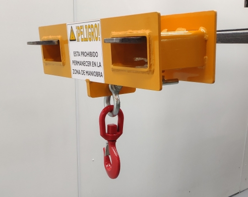 Gancho para carretilla siendo muy útil para realizar tareas de elevación hasta 5.000 Kg. Fácil manejo y seguro puesto que posee un sistema de anclaje por medio de una maneta de sujeción para asegurar un buen amarre a las uñas.