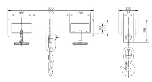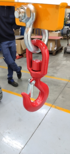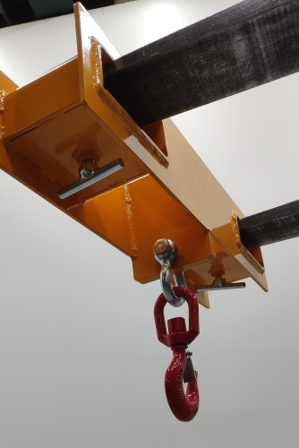 Gancho para carretilla siendo muy útil para realizar tareas de elevación hasta 2.500 Kg. Fácil manejo y seguro puesto que posee un sistema de anclaje por medio de una maneta de sujeción para asegurar un buen amarre a las uñas.