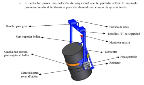 Volteador de bidones para grúa y carretilla, siendo muy útil para realizar tareas como manipulación, transporte y vaciado tanto de bidones de 200-50 litros metalicos y de plastico, siempre que no supere de 300 Kg. Fácil manejo y seguro puesto que posee un sistema de volteo por medio de una manivela. El bidón puede girar hasta 360 grados. Estructura muy robusta y consistente en bastidor básico para la inserción de las uñas de una carretilla o el enganche de una grúa. Manetas y cadenas de sujeción para asegurar un buen amarre a las uñas de la carretilla. Cincha de sujeción del bidón. Marcado CE. Fabricación a medida, consúltenos.