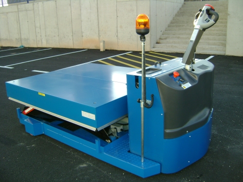 Mesa elevadora con elevación y traslación eléctrica de 5.000 Kg. Perfecta para el transporte artículos donde se necesita una base rectangular de grandes dimensiones 1.800 x 1.620 mm. Controlada mediante una botonera con seta de emergencia y un bastidor de seguridad para detener el descenso en caso de encontrar un obstáculo. Movimientos suaves gracias a su timón y su control de velocidad. Estructura de acero rectangular para asegurar la estabilidad y la resistencia de la mesa. Marcado CE. Fabricación a medida, consúltenos.