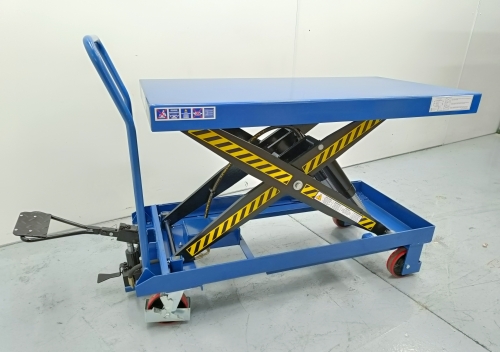Mesa elevadora manual de tijera rodante de 2.000 Kg que permite trabajar a una altura cómoda para realizar tareas como manipulación, traslación, reparación, embalaje, control de piezas o productos, transporte de piezas en líneas de fabricación, etc. Con ellas ahorrará tiempo y facilitará enormemente el trabajo a realizar.
