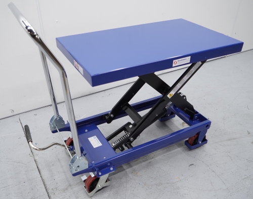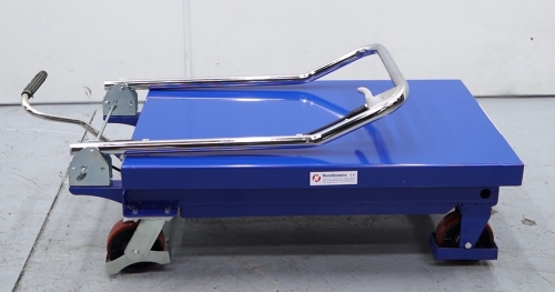 Mesa elevadora manual de tijera rodante de 500Kg que permite trabajar a una altura cómoda para realizar tareas como manipulación, traslación, reparación, embalaje, control de piezas o productos, transporte de piezas en líneas de fabricación, etc. Con ellas ahorrará tiempo y facilitará enormemente el trabajo a realizar. La elevación se realiza mediante tijera a través de pedal. Descenso seguro y continuo mediante palanca. Chasis con 2 ruedas fijas y dos giratorias de poliuretano. Ruedas orientables protegidas y con freno.