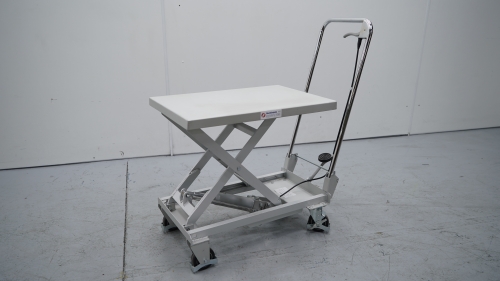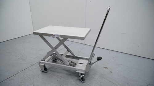 Mesa elevadora manual ALUMINIO de tijera rodante de 100Kg que permite trabajar a una altura cómoda para realizar tareas como manipulación, traslación, reparación, embalaje, control de piezas o productos, transporte de piezas en líneas de fabricación, etc. Con ellas ahorrará tiempo y facilitará enormemente el trabajo a realizar. La elevación se realiza mediante tijera a través de pedal. Descenso seguro y continuo mediante palanca. Chasis con 2 ruedas fijas y dos giratorias de poliuretano. Ruedas orientables protegidas y con freno.