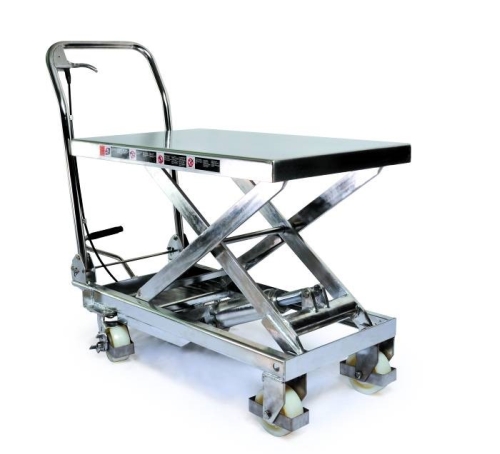 Mesa elevadora INOX AISI 304 manual (CILINDRO CROMADO) de tijera rodante de 250 Kg que permite trabajar a una altura cómoda para realizar tareas como manipulación, traslación, reparación, embalaje, control de piezas o productos, transporte de piezas en líneas de fabricación, etc. Con ellas ahorrará tiempo y facilitará enormemente el trabajo a realizar. La elevación se realiza mediante tijera a través de pedal. Descenso seguro y continuo mediante palanca. Chasis con 2 ruedas fijas y dos giratorias de nylon. Ruedas orientables protegidas de nylon y con freno.