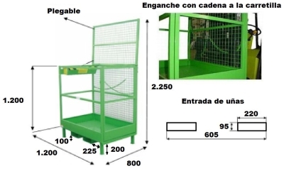 Plataforma para apilador, útil para realizar reparaciones y trabajos de mantenimiento en zonas situadas a cierta altura. Construida en acero perfilado con plataforma de trabajo antideslizante y barandilla de protección. Carga máxima de 2 personas o 300 Kg. Gran cajón para herramientas. Superficie de trabajo: 1200 x 800 mm. Aberturas de acceso para la introducción de las horquillas del apilador. Cadenas de sujeción para el amarre a la carretilla. Lateral trasero abatible para la optimización del almacenaje.