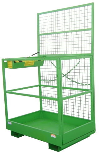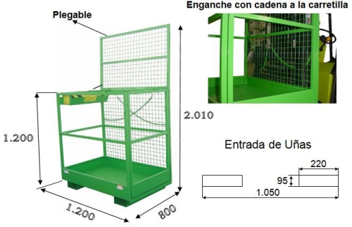 Plataforma para carretilla, útil para realizar reparaciones y trabajos de mantenimiento en zonas situadas a cierta altura. Construida en acero perfilado con plataforma de trabajo antideslizante y barandilla de protección. Carga máxima de 2 personas o 300 Kg. Gran cajón para herramientas. Superficie de trabajo: 1200 x 800 mm. Aberturas de acceso para la introducción de las horquillas de la carretilla. Cadenas de sujeción para el amarre a la carretilla. Lateral trasero abatible para la optimización del almacenaje.