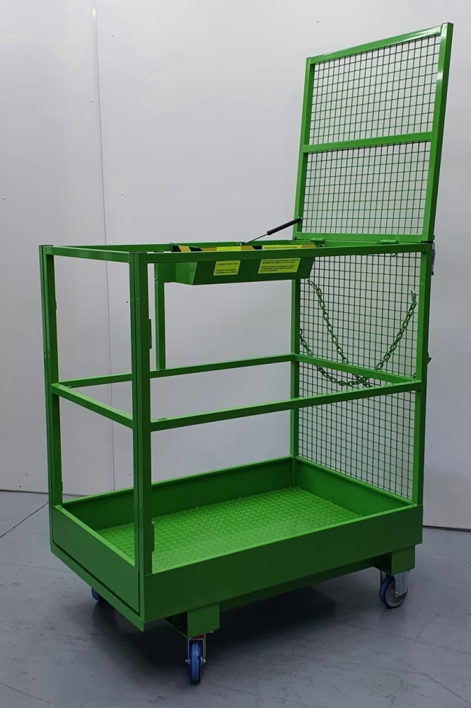 Plataforma para carretilla, útil para realizar reparaciones y trabajos de mantenimiento en zonas situadas a cierta altura. Construida en acero perfilado con plataforma de trabajo antideslizante y barandilla de protección. Carga máxima de 2 personas o 300 Kg. Gran cajón para herramientas. Superficie de trabajo: 1200 x 800 mm. Aberturas de acceso para la introducción de las horquillas de la carretilla. Cadenas de sujeción para el amarre a la carretilla. Lateral trasero abatible para la optimización del almacenaje.Con ruedas.