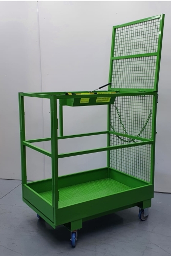 Plataforma para apilador, útil para realizar reparaciones y trabajos de mantenimiento en zonas situadas a cierta altura. Construida en acero perfilado con plataforma de trabajo antideslizante y barandilla de protección. Carga máxima de 2 personas o 300 Kg. Gran cajón para herramientas. Superficie de trabajo: 1200 x 800 mm. Aberturas de acceso para la introducción de las horquillas de la carretilla. Cadenas de sujeción para el amarre a la carretilla. Lateral trasero abatible para la optimización del almacenaje. Con ruedas, para apilador, entrada de uñas lado 800.