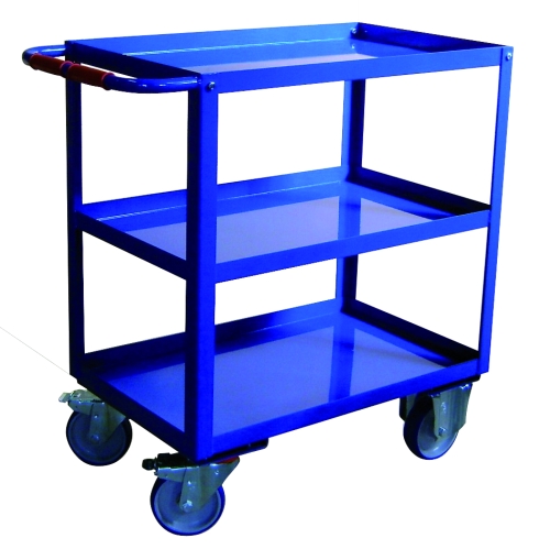 Carro porta-herramientas fabricado en perfil de acero, superficies metálicas de gran resistencia, perfecto para el transporte y almacenaje de todo tipo de artículos, capacidad máxima es de 350Kg. 2 ruedas fijas y 2 ruedas giratorias con freno. Las tres bandejas tienen una altura de 35mm. Separación útil entre baldas 305 mm.