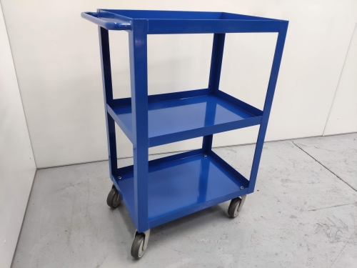 Carro porta-herramientas fabricado en perfil de acero, superficies metálicas de gran resistencia y con fondo, perfecto para el transporte y almacenaje de todo tipo de artículos, capacidad máxima es de 150Kg. 4 ruedas giratorias de goma.