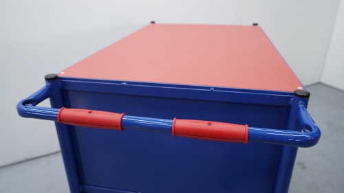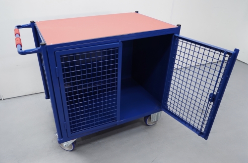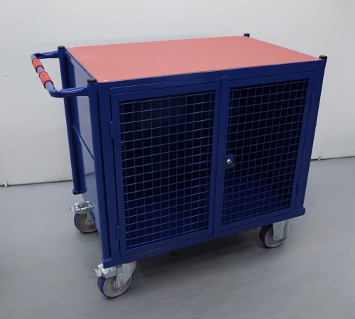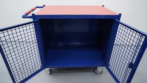 Carro portaherramientas construido en acero perfilado y tubo de acero, perfecto para utilizarse en talleres y en todo lugar donde se realicen trabajos de montaje, reparaciones, fabricación, etc. Puertas con malla de 50x50 y con ojales para introducir un candado. Superficie de fibra de madera roja. 2 ruedas giratorias con freno y dos ruedas fijas.